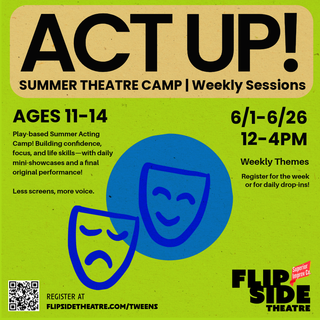 Is your kid climbing the walls? Connected to a device like a high powered magnet yet reluctant to make eye contact? Visions of a monosyllabic phone zombie in the making? Time to level up and help them learn how to act!! Sign up for a week of life-skill bootcamp packaged in a play-based, kid-centered acting camp! We’ll lay the foundation of acting technique on and off the stage and provide an opportunity to showcase the skills and concepts learned in a mini-showcase at the end of each day, culminating in an original showcase performance at the end of the week! Take an actual break this summer, trade stressing for hilarious self-expression, and empower your kid to get their voice heard!